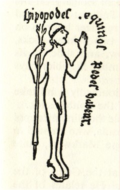 ‘…Roman writer [Pomponius] Mela (A.D. 50) and Pliny the Elder who… mention men with horses’ feet… Mela speaks quite briefly of some fabulous people, including the “Hippopodes who have horses’ feet.” And Pliny, in Book IV of his famous Historia naturalis, has not much more to say of them. “There are also said to be other (islands) in which men are born with the feet of horses, called Hippopodes.’ 3