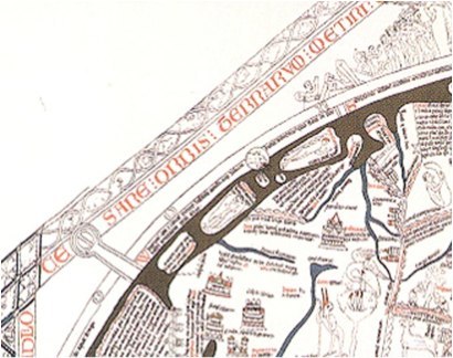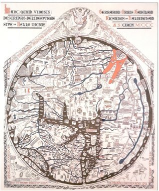 - Illustration of 1280 Hereford map of Richard de Hollingham, first published by K. Miller, 1896 (image obtained by Google search on Internet)